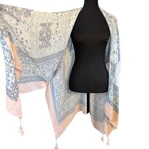 Pastel Blue Floral Kimono Shawl Wrap – Lightweight Boho Scarf with Tassels – Res