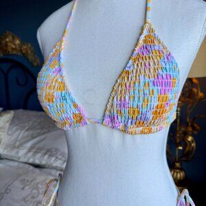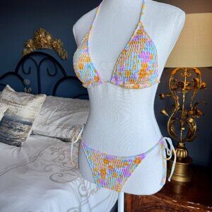 Multicolour pastel floral smocked bikini from Shein, size M. Adjustable ties, padded top. Never worn, in original bag, only taken out to look at and take photos. Too cheeky for me! Cat friendly, nonsmoking home.