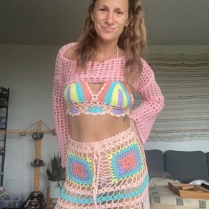 Size small/ medium knit skirt, top and sleeves. The fringe of the skirt goes to the floor. Worn once. In excellent condition. Stretchy and adjustable.