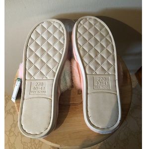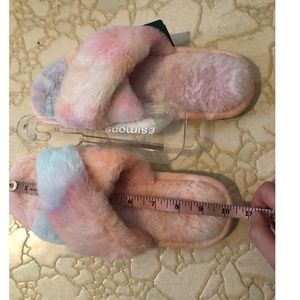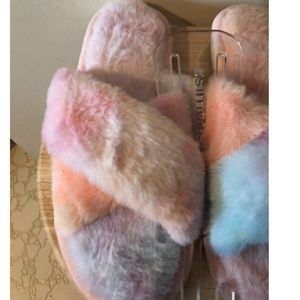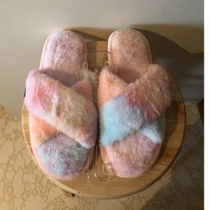 Pastel faux fur crossed slide slippers new with tags. Padded cushiony insoles, textured rubber outsoles. Very cute and cozy, perfect for a gift. Marked size EU40-41 but fit smaller imo. Insole is a little over 10’’, so it would fit like a size 9-9.5. This item comes from a smoke free, pets friendly home. Recycled bags/box used when possible. Please, let me know if you'd like any additional pictures and/or measurements or other info. Thanks for watching!