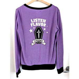 I really love this sweater but I just don't find myself wearing it as much anymore as it no longer fits with my current style. The graphic and details are so cute! Look at the skeleton bursting out of the coffin! So adorable. The material of this is very unique, I'm not sure what it is but it feels like a super soft knit jersey. It has an almost fuzzy texture to it. It's very comfortable and soft. There is no size tag but I feel like the size is pretty flexible, between XS - M depending on desired fit.