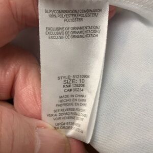 This is in like new condition. It’s constructed with two pieces that are joined together at the shoulder. The inner white slip is made of 100% polyester and has some nice stretch.