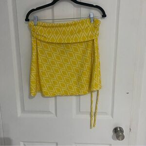 Picturing a yellow printed cotton/tencel/lyocell waist ruched mini skirt by patagonia in a size large.