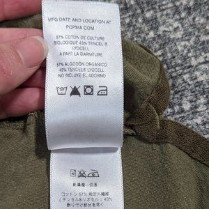 Stretchy cotton A-line dress, henley snap front, 3/4 length sleeve with strap to shorten length, two breast pockets.