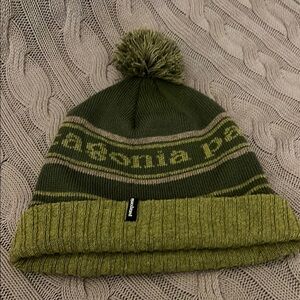 Stylish green knit beanie with a pom-pom. Features Patagonia branding. Used in good condition signs of wear