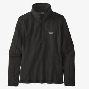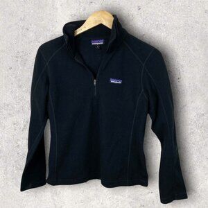 Patagonia Micro Fleece 1/4 Zip Pullover Sweater in Black and Women's Size Small. 100% recycled polyester. Lightweight. Stand up collar. Machine washable. Very good pre-loved condition. No visible flaws.