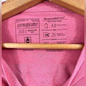 Soft pink tee with short sleeves. Patagonia logo on chest. Comfortable and stylish.