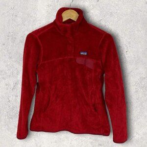 Patagonia Re-Tool Snap Pullover in Red and Women's Size Small. Made of recycled polyester. Slim fit. Classic snap-t chest pocket with a nylon flap and stand-up collar. Toasty warm kangaroo pocket. Made from lightweight high-pile Polartec Thermal Pro polyester fleece with extra long fibres that provide warmth without bulk. Made in Mexico. Very good pre-loved condition. No visible flaws.