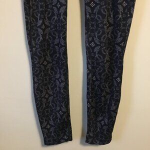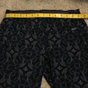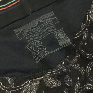 Good preowned condition, black (with faintest tint of blue) and white lace-like pattern, base layer, midweight leggings with banded waist by Patagonia. Perfect for any layering or athletic sport. Very comfortable