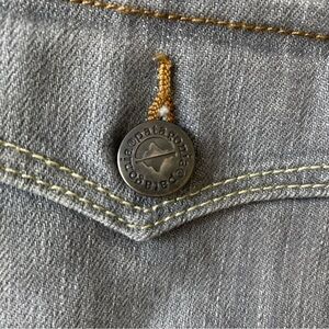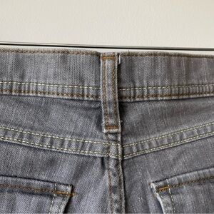 Rolled up double-stitched hem. Light grey wash. Five pockets style. Mid-rise. Two back pockets with button closure. Decorative design on inner pocket lining.