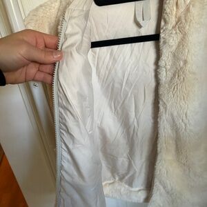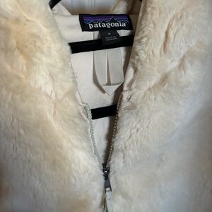 Patagonia vest with zipper enclosure and hood. Fur exterior, soft silky interior. Very warm, perfect for layering underneath a shell jacket. Excellent condition. This vest is not reversible. It has pockets on both sides.