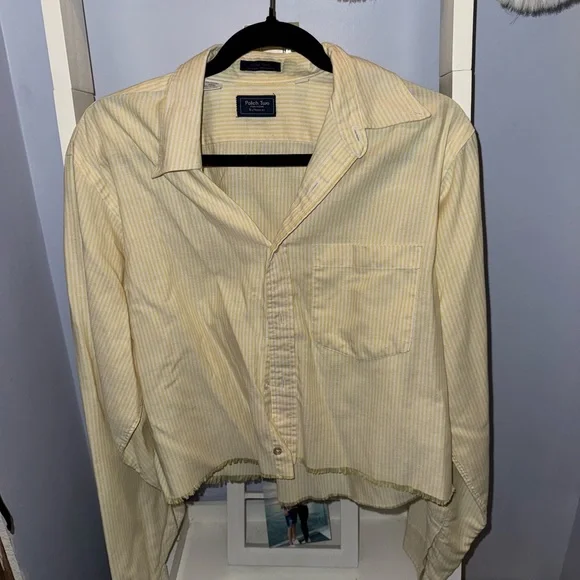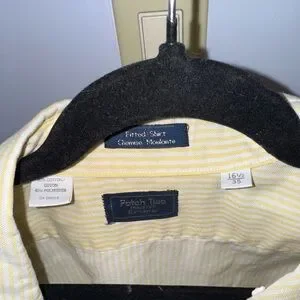 Patch Two yellow striped button-down shirt with a relaxed fit in size 16.5/large. Lightweight fabric for breathable all-day wear. Features a classic collar and single chest pocket for a polished look. Subtle vertical stripes add textural interest and versatile style. Worn a decent amount but in such good condition. I love this top
