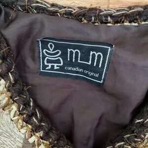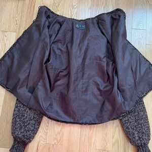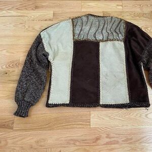 Stylish patchwork knit cardigan with a mix of brown and cream colors. Features a unique design with textured sleeves.