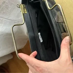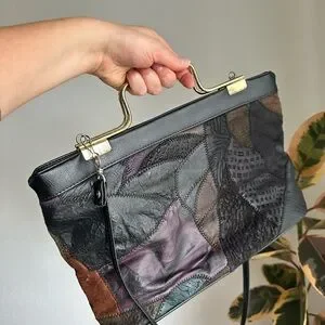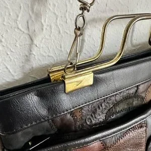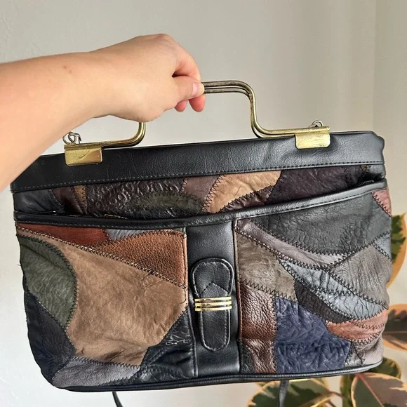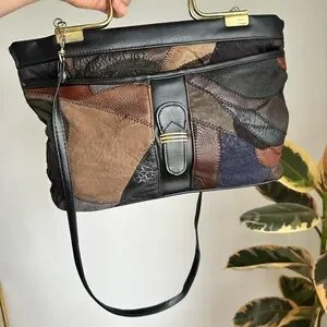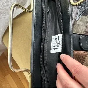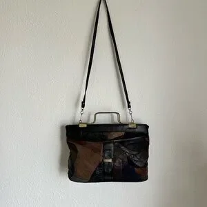 Stylish patchwork leather handbag featuring a blend of black, brown, and tan colors. Perfect for adding a unique touch to any outfit. From the 1980s. Made by Pagani, genuine leather.