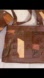 Stylish patchwork leather handbag set. Includes a main bag, clutch, and pouch. Features brown and tan tones.