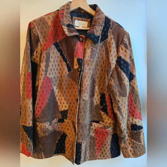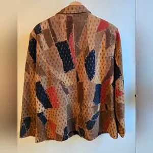 Stylish genuine leather patchwork jacket featuring a mix of colors. Button closure and front pockets add functionality.
