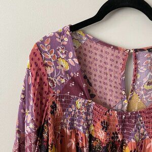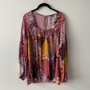 Embrace bohemian style with this vibrant patchwork tunic top. Featuring a mix of red, orange, and purple hues, this top is perfect for adding a pop of color to your wardrobe. Ideal for casual outings, it offers both comfort and style.