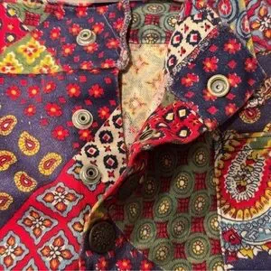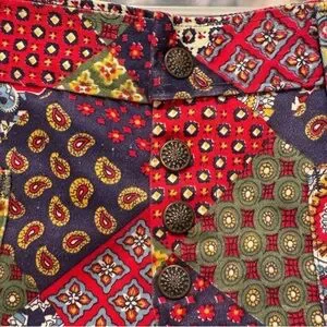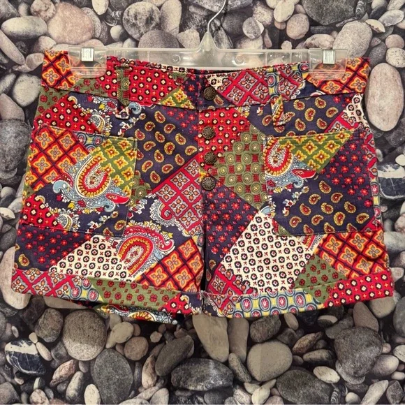 70’s Vintage jean shorts showcase a lively patchwork design in striking red and green hues. Soft brushed denim cotton. Has a slight stretch to it. Feature a structured waistband with belt loops, low cut hipster style!