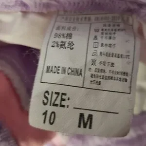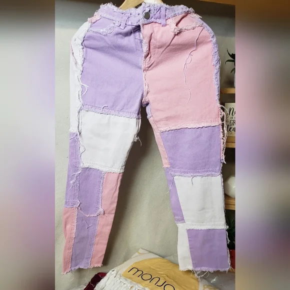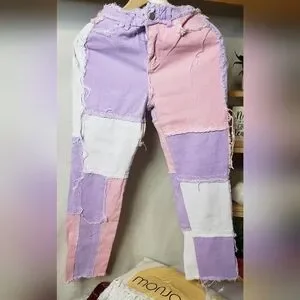 Stylish patchwork jeans in pastel shades. Features pink, purple, and white patches. Perfect for a trendy look.