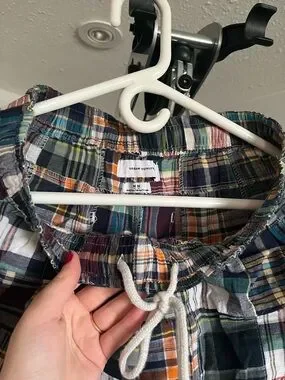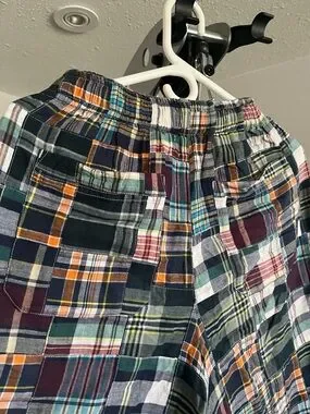 Casual drawstring pants with patchwork plaid pattern. Elastic waistband with functional tie. Soft woven fabric in mixed plaids. Size M/L, around a 6/8