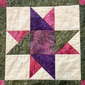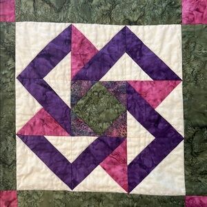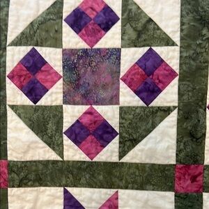 Add a touch of elegance to your bedroom with this beautiful patchwork quilt. Featuring a vibrant mix of green, purple, and cream, this quilt is perfect for adding warmth and style to your home bedding collection. Believed to be handmade but cannot confirm