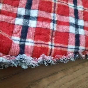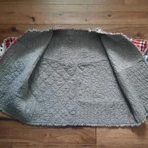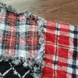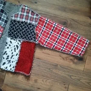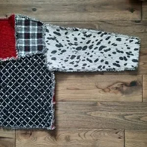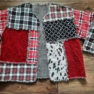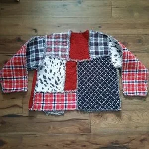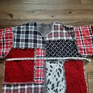 Great used condition unique patchwork open front jacket. Cottagecore. Possibly handmade as no tags attached. Quilted texture. Size will probably fit a large or extra large. Is quite oversized. Frayed "rag quilt" detailing. Feels like cotton materials used, some flannels. Great unique find /statement piece.