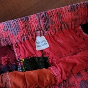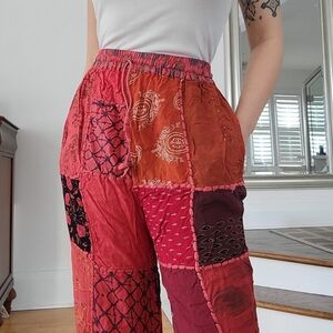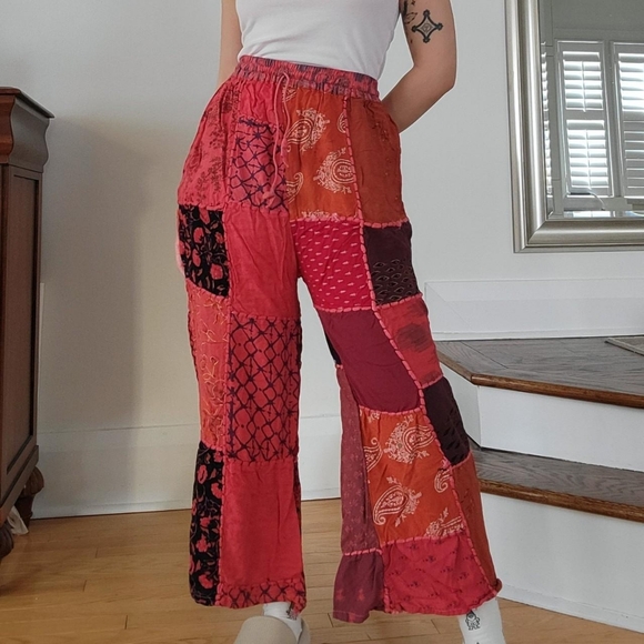 Beautiful red patchwork pants, with pockets, elastic waist, and drawstrings. Wide flowy fit and 100% rayon. No size marked but would best fit a small-medium! Waist measures 26 inches and comfortably stretches to 30 inches.