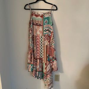 You'll love the mixed prints and colors in the Patchwork Dreams Dress! This darling dress has a spaghetti strap and asymmetrical hemline that give a laid back look. Pair it with strappy sandals and a straw hat for a day of fun.