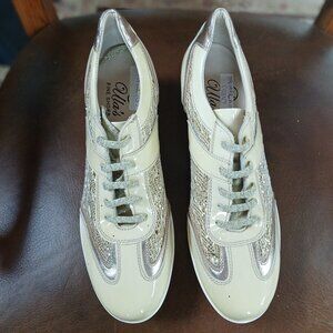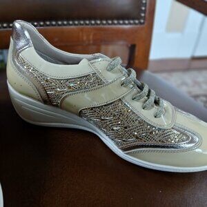 For a little pzazz in your step, these are the bomb. Patent cream/gold leather uppers with a smart cream/gold sequined contrast element and correlated laces . Topped with a smart darker gold leather contrast to complete the look . Handmade in Europe. Synthetic gripped outside sole. 2" raised wedge heel. Can be worn out on the town .