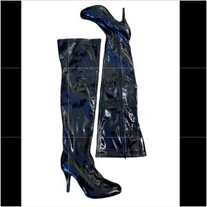 Unworn, patent over the knee boots in black. Large is equivalent to a Size 10.