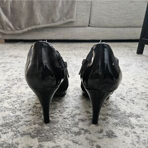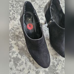 with zipper, bandolino brand, needs some suede cleaning otherwise in good condition, cute ankle length , heel and platform on front, very comfortable