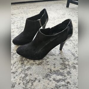 with zipper, bandolino brand, needs some suede cleaning otherwise in good condition, cute ankle length , heel and platform on front, very comfortable