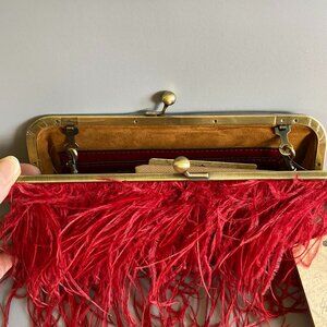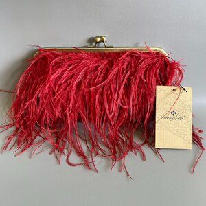 New in Original packaging, Patricia Nash Ruby Red Ostrich Feather Potenaz Frame Statement Bag. Features a kiss lock closure, lush ostrich feathers adorn the front, chain strap can be tucked inside bag to worn as clutch, built in card slots. Interior is lined with soft faux suede fabric. A true vintage inspired evening Statement bag, Simply Gorgeous. Full measurements in photos.