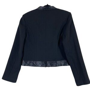 Beautiful tailored black wool blend jacket top slightly cropped round neck zipper closure decorative trim at neckline and hem detail. Patrick Mendez France jacket with soft shoulder padding . Unique and Stunning piece!