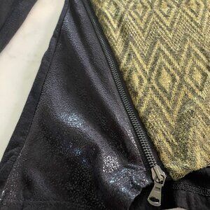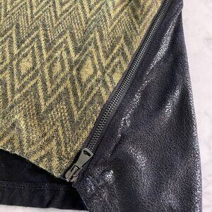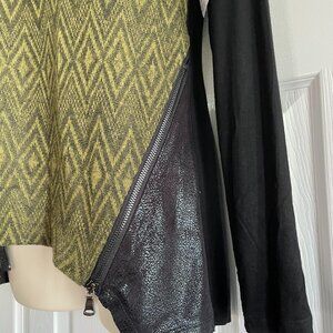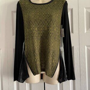 Olive and Black diamond pattern knit top with faux black leather / animal skin, flared side accent panels and neck band. Side panels can be zipped closed or opened for a unique look (see photo). Back is plain black soft light spandex knit with a longer fall to it. Gorgeous!