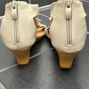 Harlequin sandals in a beige faux leather with floral detail. Comfortable wedge heel approx. 2.25-2.5" high with back zip. Super cute summer shoe! Brand new, never worn condition. Shoes came without tags attached but sticker is still attached to bottom of shoe.