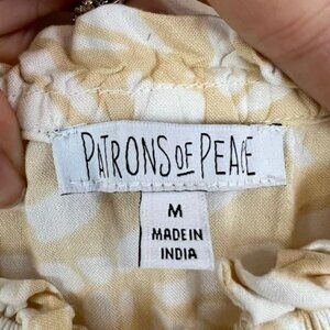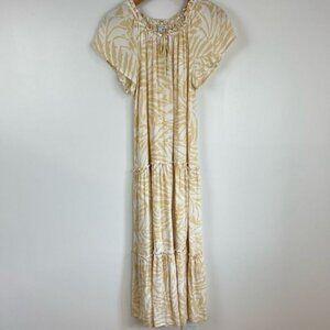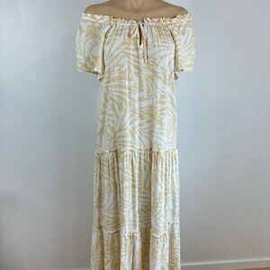 Patrons Of Peace Dress Size M Maxi Ruffle Tier Tie Neck Off Shoulder Tan White