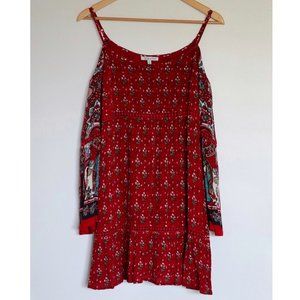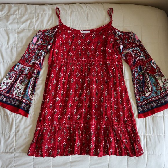 Patrons of Peace Red Cold Shoulder Bell Sleeve Flare Dress, worn once