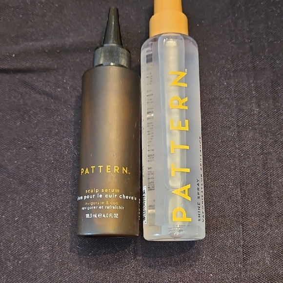 Pattern hair care set with scalp serum and shine spray. Black and clear bottles with yellow text.