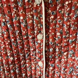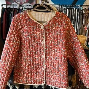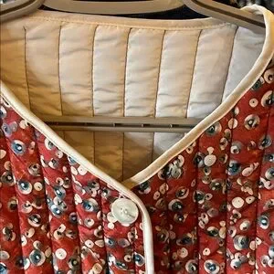 Red pattern quilted jacket with cream trim and buttons.