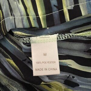short grey green black and yellow pattern dress with faux leather accents and black belt. beautiful pattern and fit. vibrant colours.