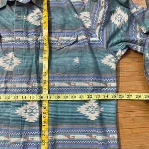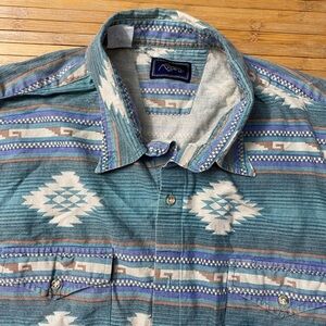 vintage long-sleeve shirt featuring a Southwestern or Aztec pattern in shades of teal, blue, and white. The shirt has a button-down collar, two chest pockets, and a textured fabric, possibly a brushed cotton