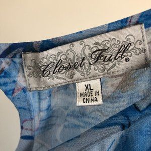 Blue patterned beach coverup, features floral design on the front, cinched waist, and light fabric. Size XL.