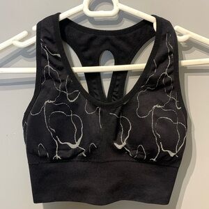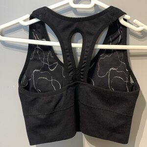 Very cute sports bra in black with a white abstract floral pattern . No size tag, ribbed band measures 13" unstretched. Fits like a medium.