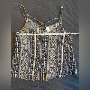 This v neck cami has a tribal pattern and a cross strap detail on the back. Cut loose through the body and short length. In good condition but this is a used item, I can’t find any obvious flaws but there could be some wear and tear.