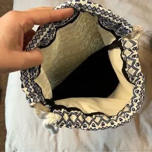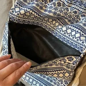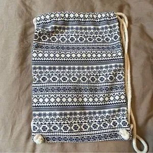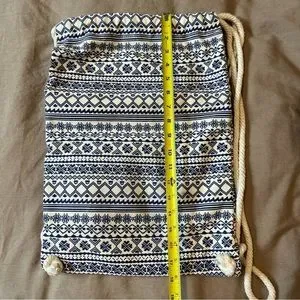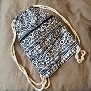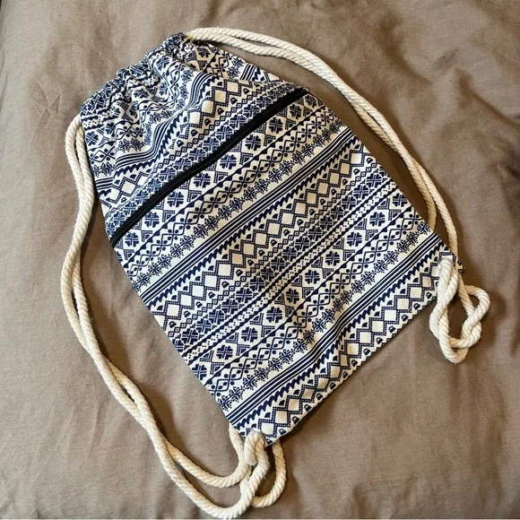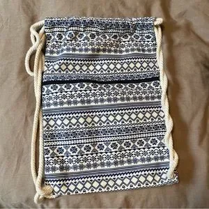 Beautiful patterned backpack. Thicker, canvas like material. Top drawstring/ straps and front large zippered pocket. In good preowned condition, some light wear from normal use, see photos