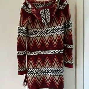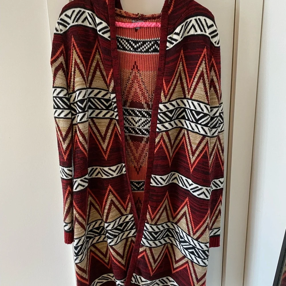 Geometric patterned open front sweater. Fits like Medium Red, black, and cream colors. Condition is medium wear.