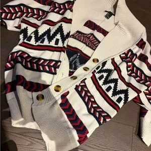 Stay stylish and warm with this womens patterned cardigan sweater. Featuring a bold design in red, blue, and white, this sweater is perfect for any casual occasion. The button-up front adds a classic touch to your wardrobe.