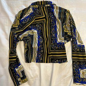 This top is a beautiful patterned blue, yellow, black and white chiffon button down with a knot detail in perfect condition.