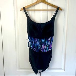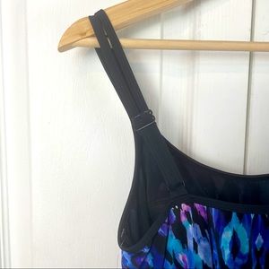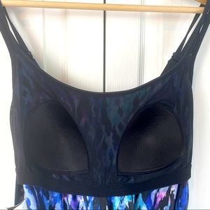 Suit is fully lined and has adjustable straps. Inner lining has soft structure cups for support. Waist is elasticized and meant to have a ‘blousson silhouette’. Sides can be cinched/tied or left flat.